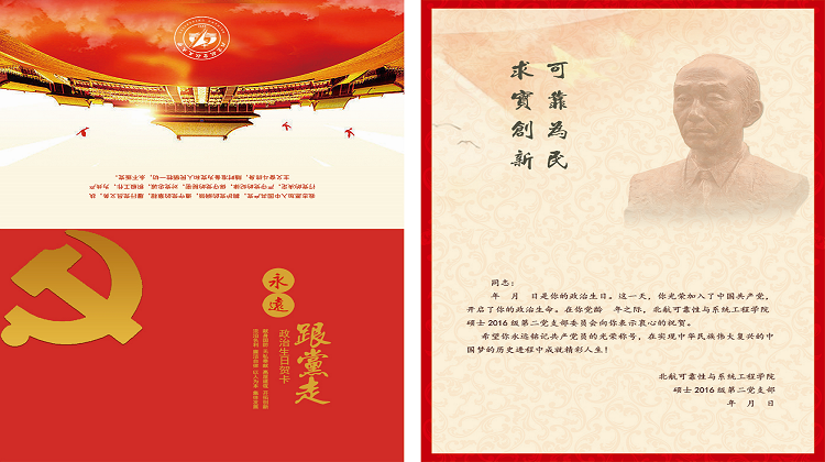 近日,为深入学习、贯彻、落实习近平总书记在全国高校思想政治工作会议上的重要讲话精神、增进学生党员与党组织的联系,可靠性与系统工程学院硕士2016级第二党支部自主设计、制作了“政治生日”贺卡,使支部党员牢固树立“第一身份是党员”的意识。