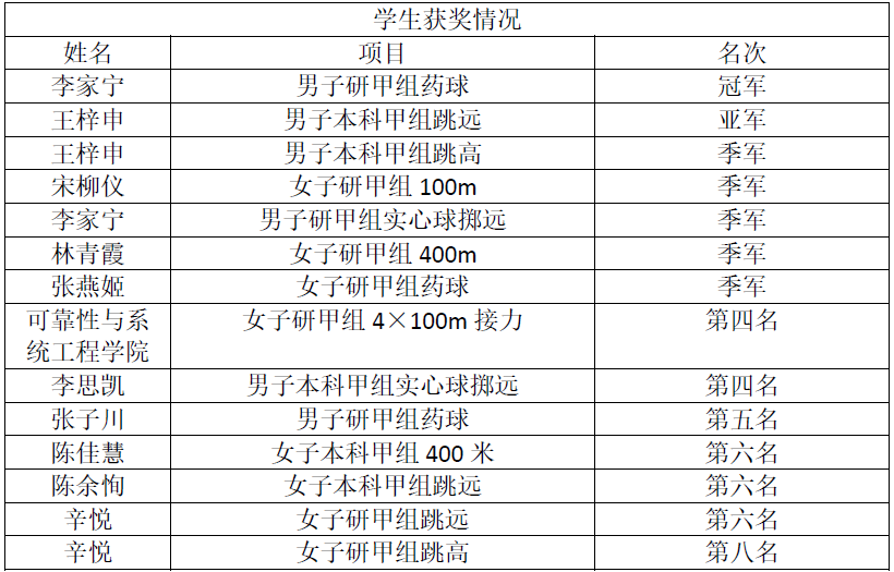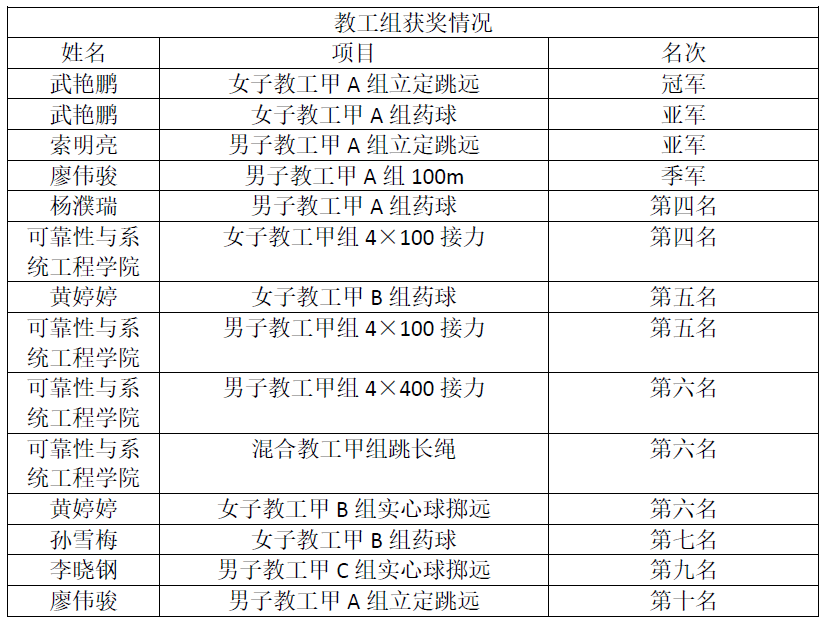 在全体参赛师生的共同努力下,可靠性与系统工程学院在本次运动会中斩获佳绩!其中,冠军2名,亚军3名,季军5名,多个项目获得前十名。学院参赛老师们获得教工甲组团体总分第五名,学院获得道德风尚奖,硕果累累!