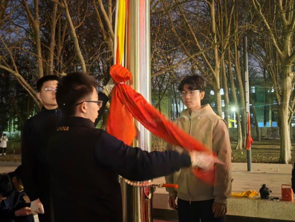 3月19日,241413支部与231413支部举办了升旗仪式,同学们在团支书的组织下升国旗、唱国歌,表达对祖国的深厚情感和衷心祝福。