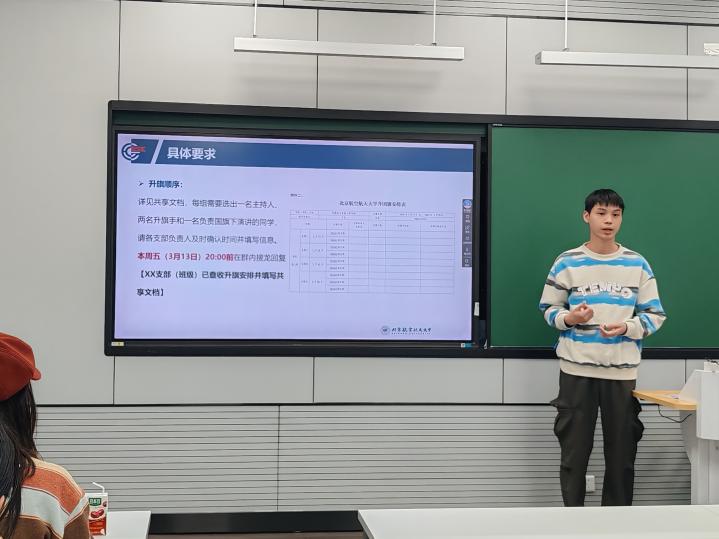 为确保升旗任务高质量完成,学院分团委于3月11日下午在主213组织召开了升旗仪式工作培训会。培训会由学院分团委组织部彭祖铭主持,他就升旗仪式的流程规范、人员分工、注意事项等内容进行了详细讲解,要求各支部高度重视、认真准备,以饱满的精神状态展现可靠青年的良好风貌。